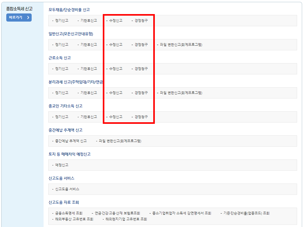 4. 아래로 스크롤하여, 기존 신고했던 유형에 따라 수정신고 및 경정청구를 선택해 줍니다.