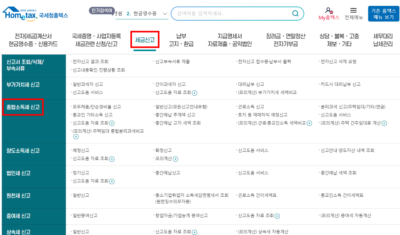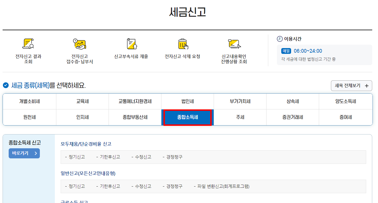 3. [세금신고]창에서 [종합소득세]를 선택해 줍니다.