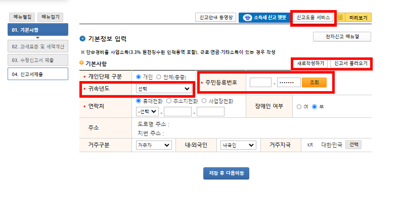 - [주민등록번호] : [조회]버튼을 눌러 기본사항을 불러옵니다.