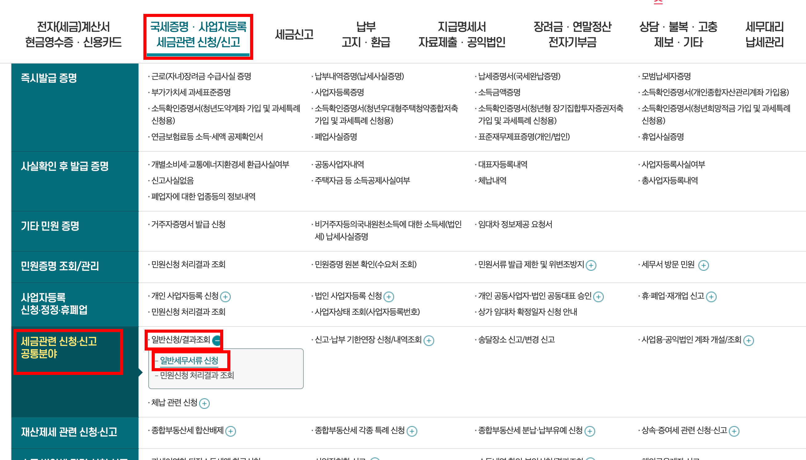 - [국세증명·사업자등록·세금관련 신청/신고] ->[세금관련 신청·신고 공통분야] -> [일반신청/결과조회] -> [일반세무서류 신청]
