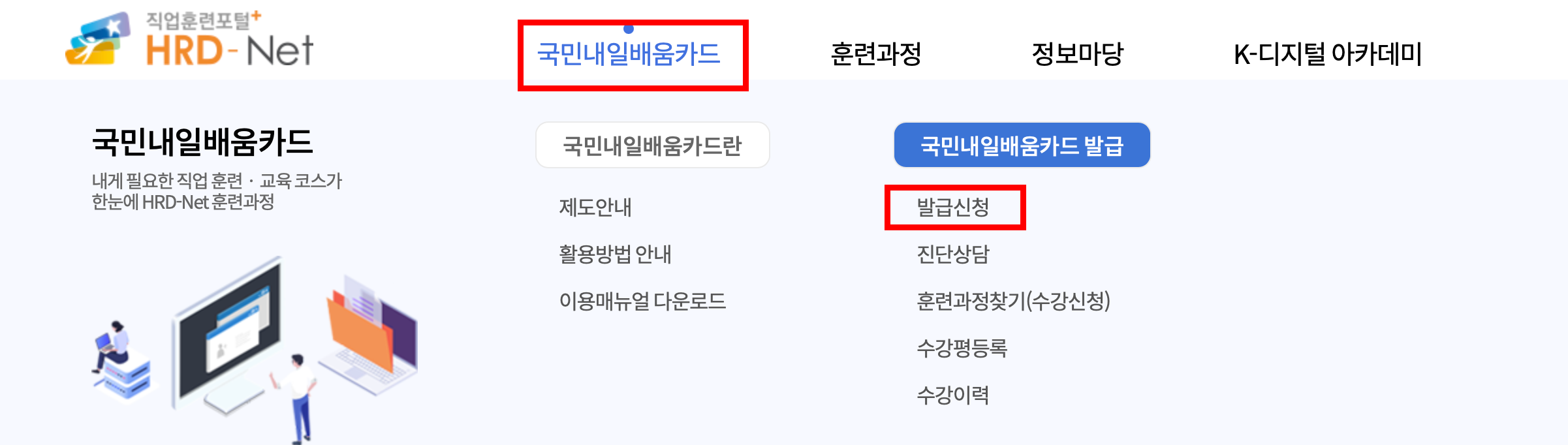 상단 메뉴에서 [국민내일배움카드]를 선택한 후, [발급 신청]을 클릭합니다.