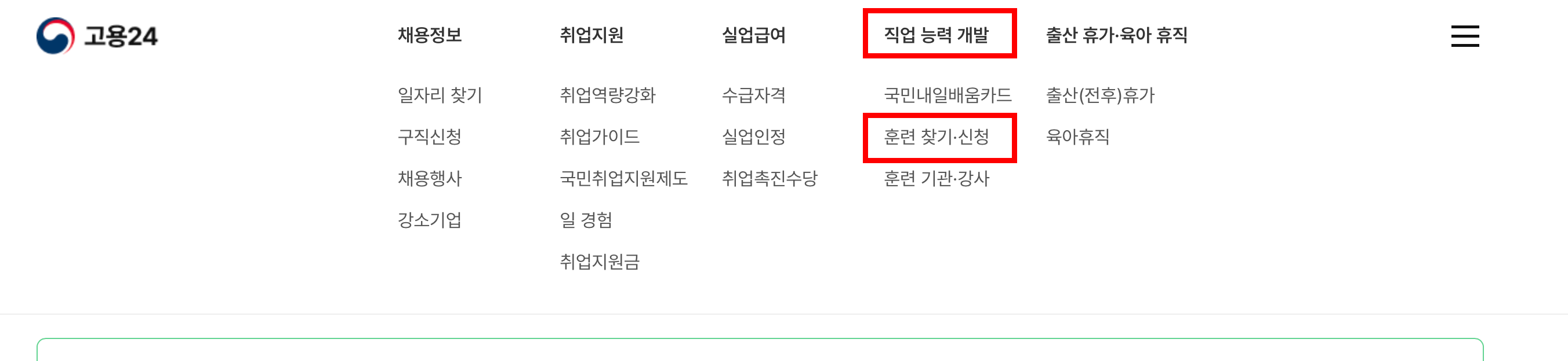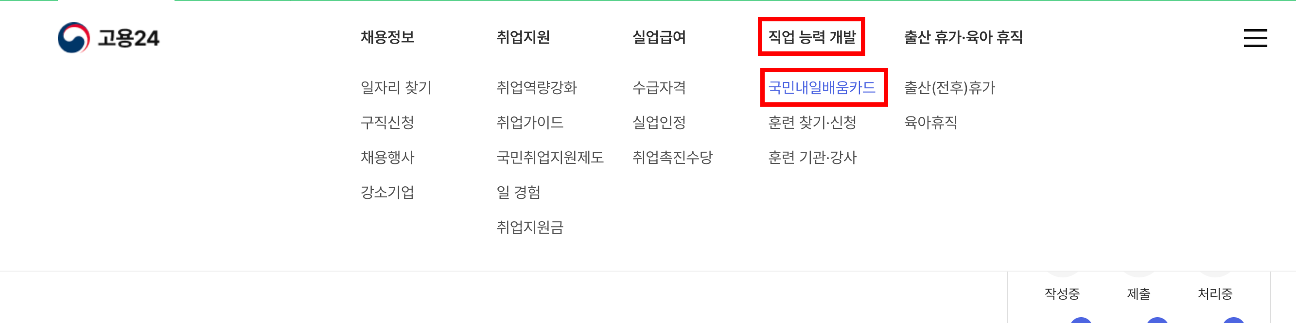 상단 메뉴 [직업 능력 개발]에서 [국민내일배움카드]를 선택합니다.