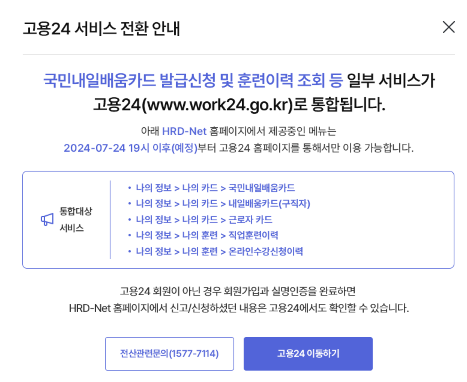 카드 등록 및 결재는 고용 24로 이동하였기 때문에