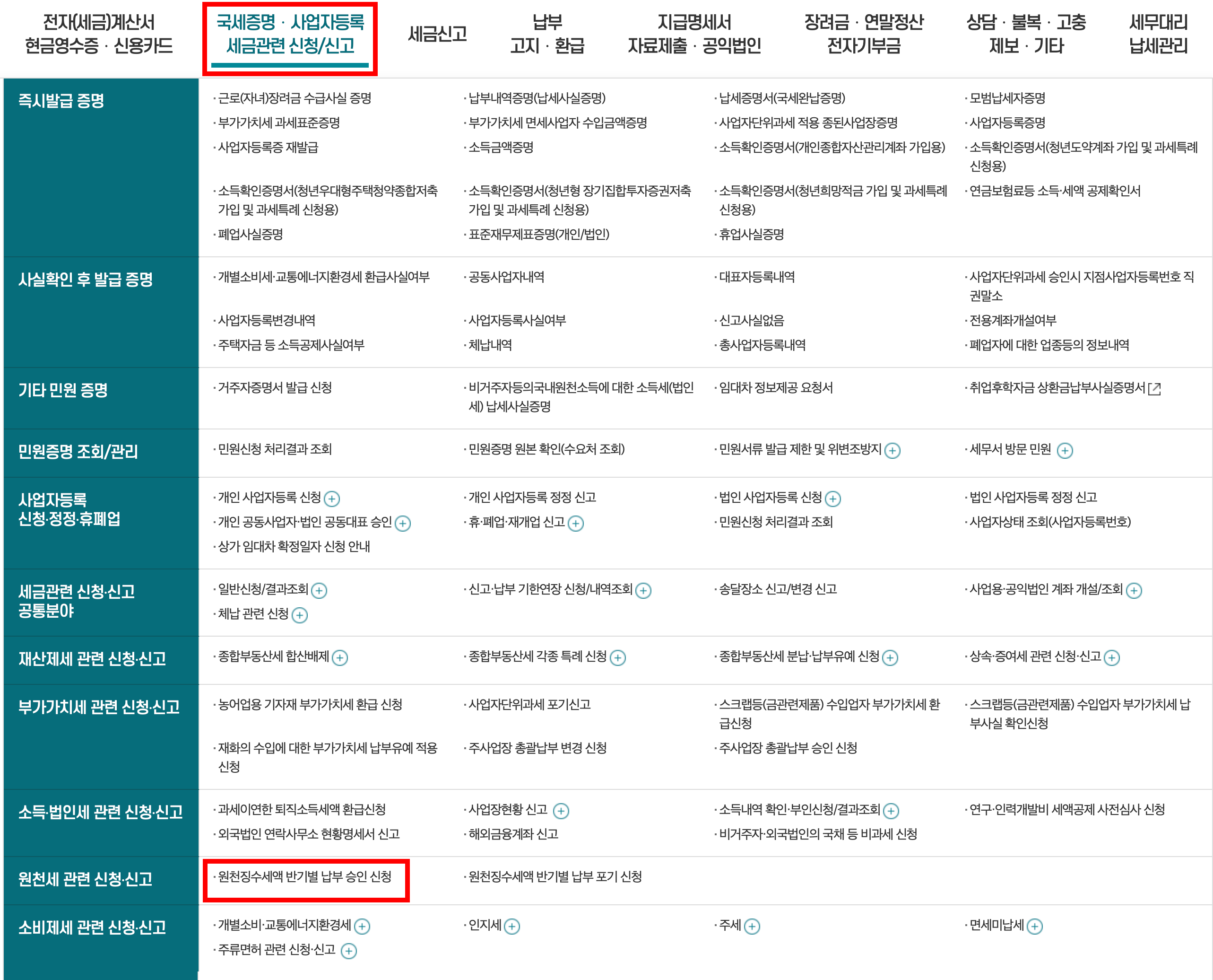 2. [국세증명,사업자등록,세금관련 신청/신고] - [원천세관련 신청/신고] - [원천징수세액 반기별 납부 승인 신청]