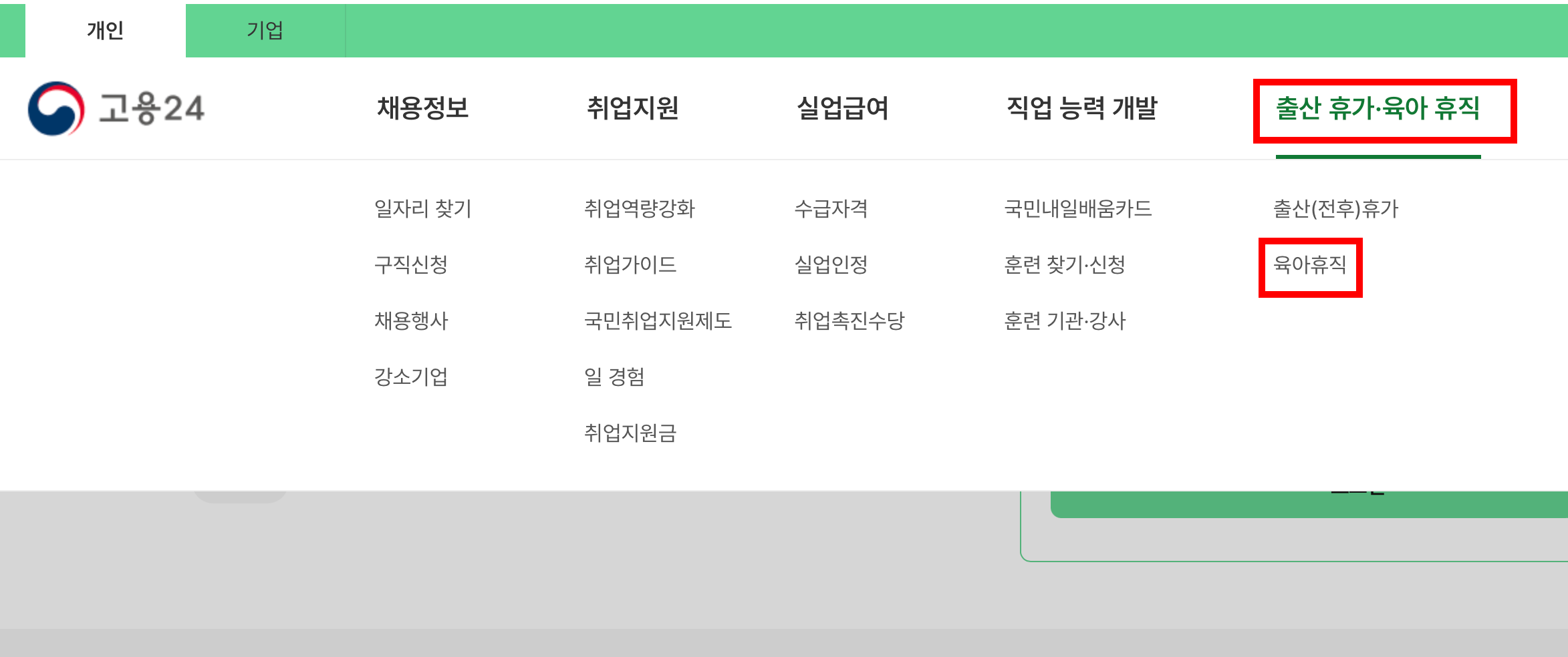 2. 상단메뉴의 [출산 휴가,육아 휴직]->[육아휴직]을 클릭합니다.