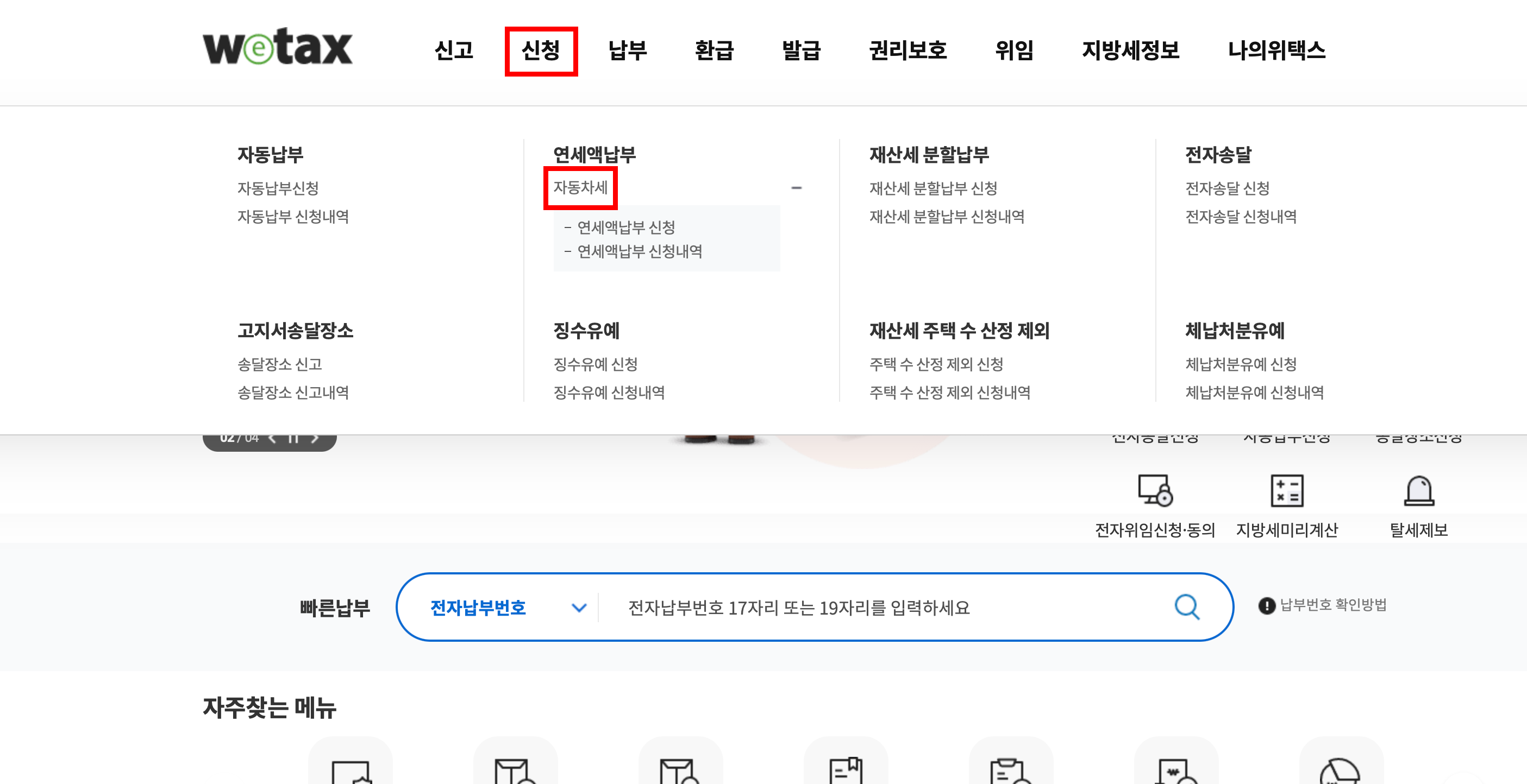 2. 상단메뉴 [신청] -> [자동차세] -> [연세액납부 신청]