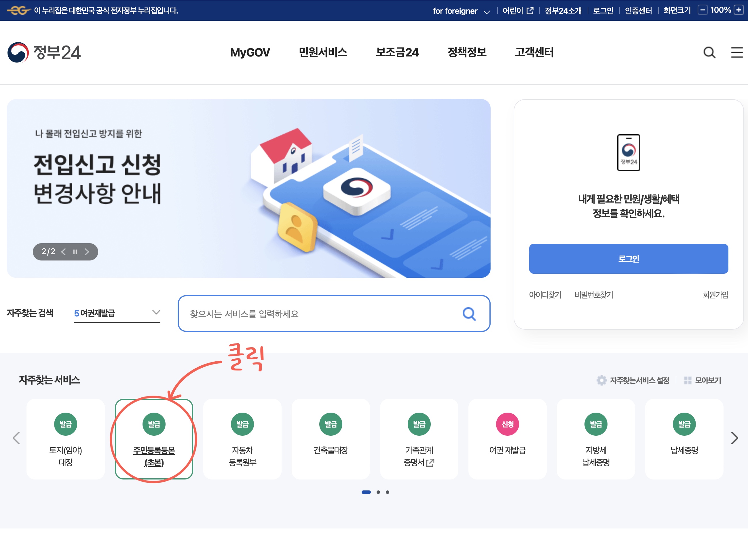 2. 홈페이지 중앙 부분에 [자주찾는 서비스] 항목에서 [주민등록등본(초본)]을 선택합니다.