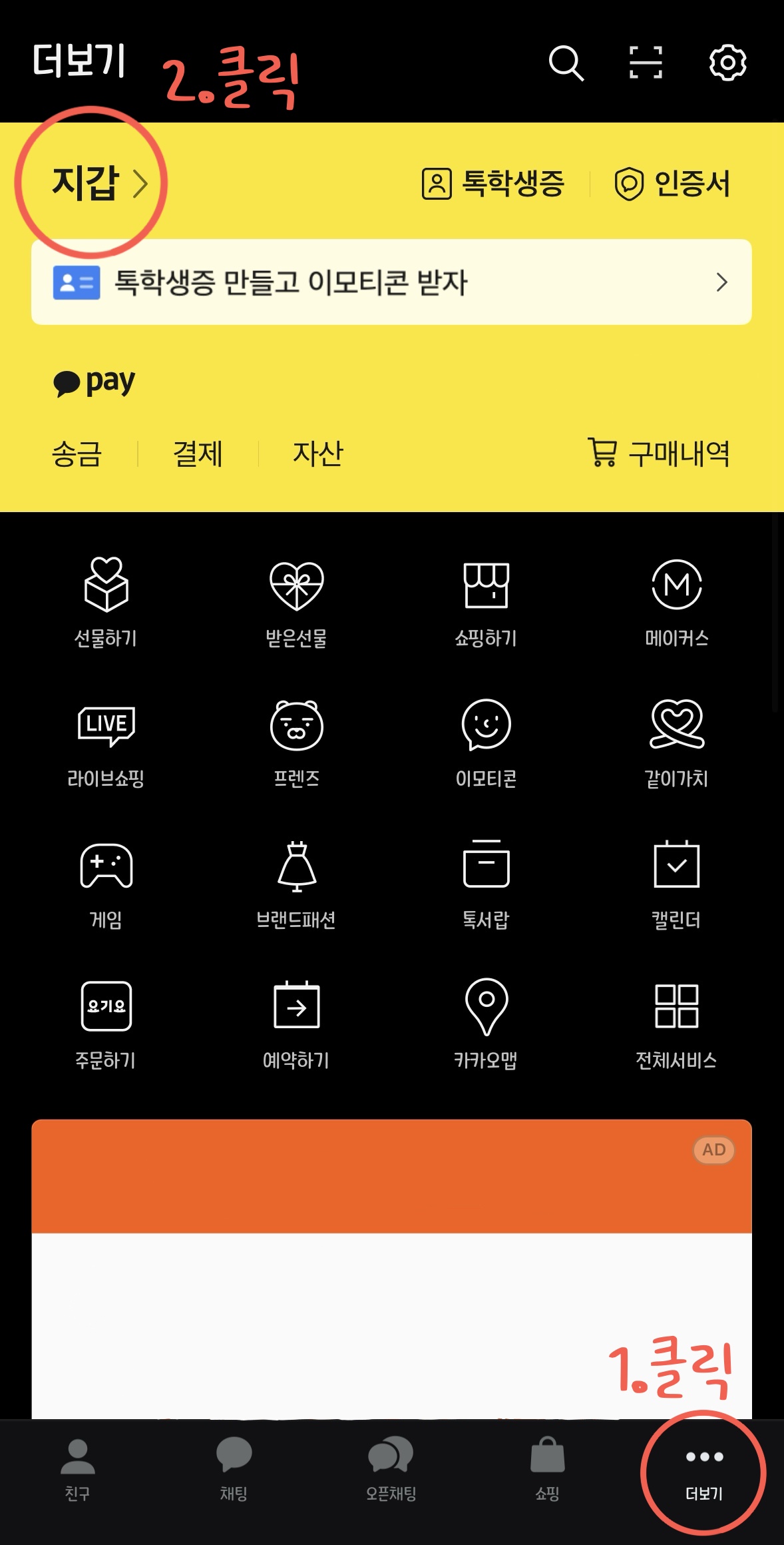 1. 카카오톡 앱을 실행하고 우측 하단의 [...더보기] 메뉴를 클릭합니다.