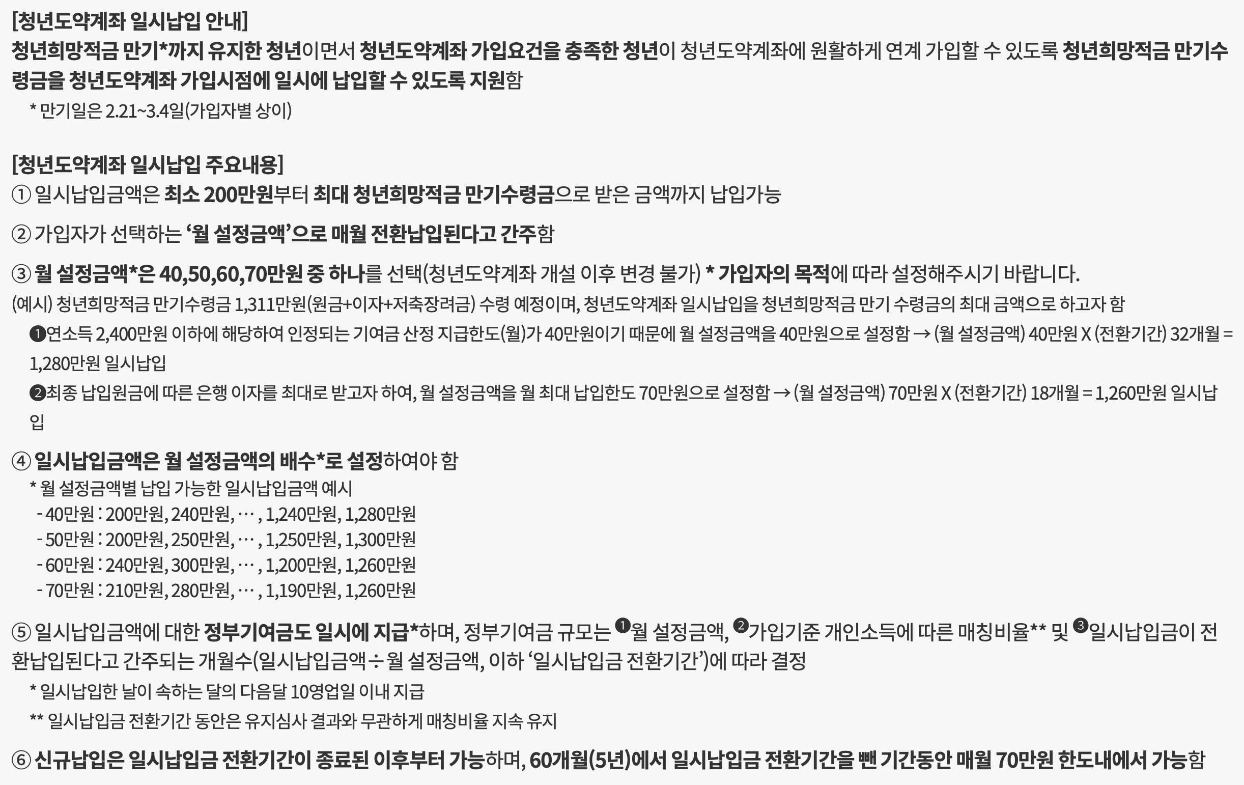 청년도약계좌 일시납입은 청년 희망적금 만기 수령금을 청년도약계좌에 한번에 넣을 수 있도록 하는 제도입니다.
