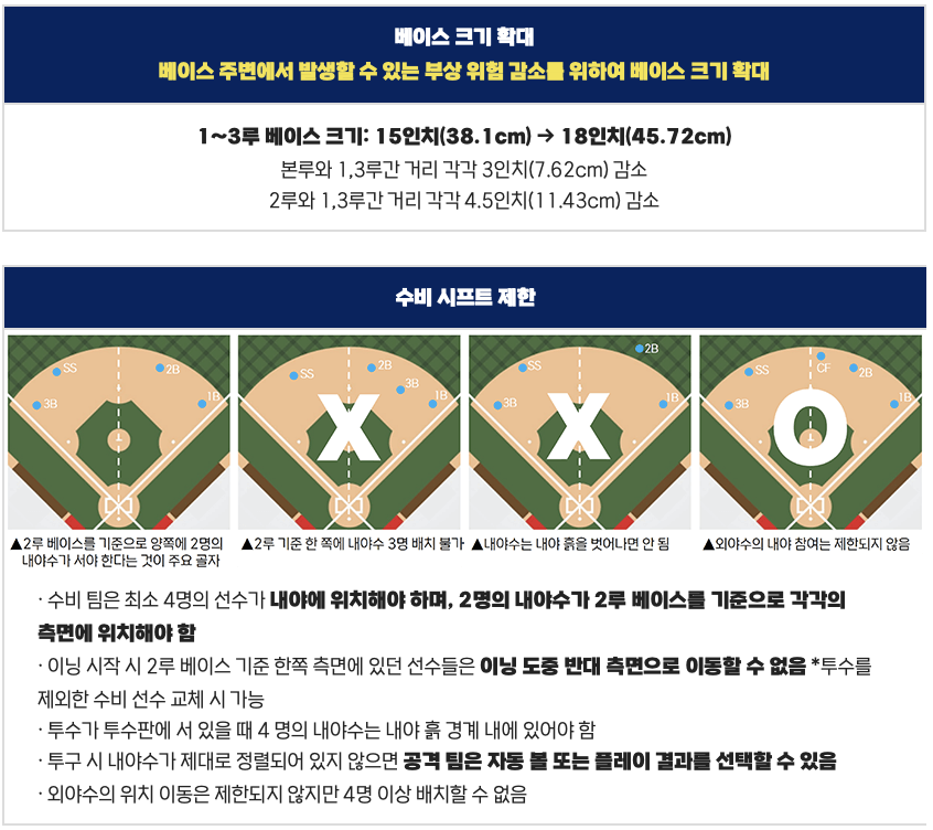 부상 위험을 줄이기 위해 1루, 2루, 3루 베이스의 크기가 18인치로 확대 되었습니다.